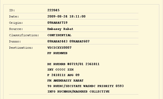 Wikileaks apporte des preuves palpables sur la situation précaire au royaume de Mohamed VI. Aujourd’hui, nous présentons aux lecteurs le câble envoyé, le 24/08/2009, par Robert Jackson, agréé politique de l’ambassade des USA à Rabat, sur la justice marocaine. Ce document offre des détails effrayants qui mettent à nu les milieux européens qui essaient de blanchir le régime marocain.