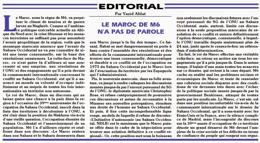 Le roi du Maroc, dans un discours qui ne laisse guère une chance à la paix dans la région à l’occasion du 39ème anniversaire de l’occupation du Sahara Occidental, inscrit dans la liste des territoires à décoloniser à l’ONU, a été clair dans la position du Makhzen vis-à-vis d’une vieille question, l’occupation éhontée du Sahara Occidental et l’asservissement de sa population. M6 l’a d’ailleurs répété et réaffirmé dans son discours: «Le Maroc restera dans son Sahara et le Sahara demeurera dans son Maroc jusqu’à la fin des temps». Ce faisant, Rabat se met dangereusement en porte à faux contre l’ensemble des résolutions et des efforts de la communauté internationale pour trouver une issue consensuelle, démocratique et durable à ce conflit né de l’occupation en 1975 du Sahara Occidental par le Maroc lors de l’évacuation du territoire par les Espagnols qui l’administraient.