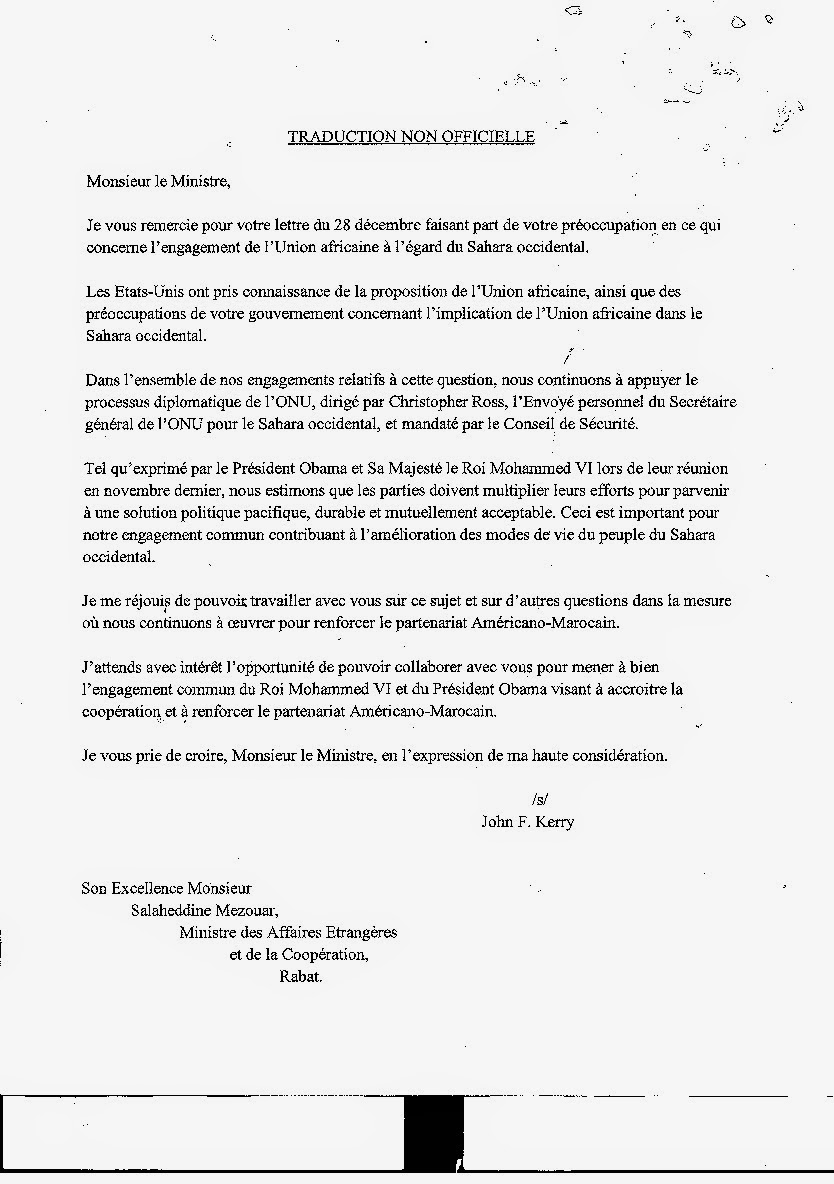 Réponse de John Kerry aux préoccupations du Makhzen concernant l’engagement de l’UA novembre 21, 2014 mahembarec Non classé 0 Réponse de John Kerry aux préoccupations du Makhzen concernant l’engagement de l’UA