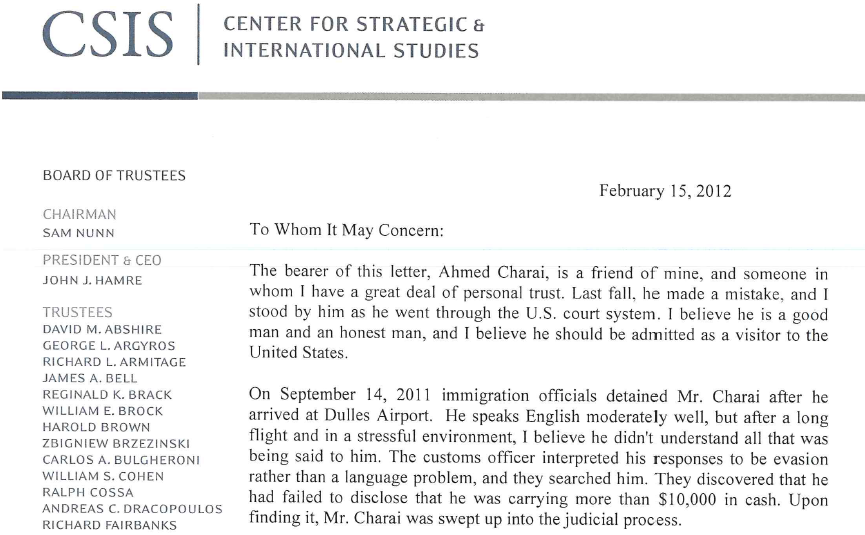 Le 17 février, Ahmed Charai a reçu une copie de la lettre envoyée par le CSIS à l’attention de différentes personnalités du Département d’Etat, de la Securité Interieure et de la Maison Blanche attestant ses liens avec cette organisation ainsi que ses relations avec les Etats-Unis d’Amérique.